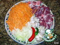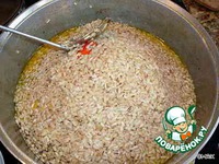 Наступает еще один важный момент – дегустация готовности риса. Для пробы берем несколько рисинок, углубившись на пару сантиментов в рисовый слой. Готовый рис, если его раскусить, должен быть упругим, но не жестким внутри. При обнаружении малейшей жесткости, выливаем на поверхность риса не более стакана горячей воды, разравниваем бугор и вновь собираем рис от края к середине, давая воде возможность провалиться внутрь. После этого выкапываем в середине рисового слоя «ямку», аккуратно укладываем туда поварившийся в зирваке чеснок и стручковый перец…