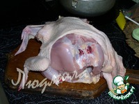 С курицы аккуратно снять шкурку, стараясь нигде не порвать (оставить только косточки у основания окорочков и крылья). |
