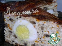 Мясо и грудку отделить от костей, перемолоть в мясорубке, лук и морковь (на терку). В фарш добавить замоченную в молоке булочку и 2 яйца, грибы обжаренные с луком, перемешать, посолить, поперчить. |