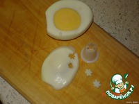 отрезать небольшой кусочек от яйца и выдавить насадкой ,получился цветочек,зубочисткой перенесем его на салат,этой же зубочисткой возьмем маленький кусочек желтка и уложим в серединку цветочка. |