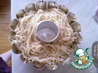 Промываем спагетти. В микроволновке (или на водяной бане) растапливаем масло. Промытые спагетти выкладываем в кексовую форму, заливаем маслицем. Даём настояться 5 минут. |