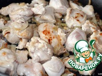 Добавить куриную грудку, нарезанную не очень крупными кусками. Обжарить до золотистого цвета. |