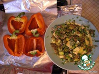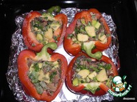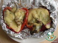 Наполнить половинки перца смесью овощей/грибов/трав. Поставить в духовку на 175-180°С, запекать около 30-35 минут (пока перец не станет мягким). |