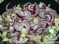 Когда мясо слегка обжарится, закинуть в сковoродку мелко нарезанный кубиками цуккини |