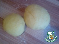 Из сметаны, маргарина, яйца, сахара, соли, соды и муки замесить тесто, чтобы оно было эластичным и не липло к рукам. Разделить на 2 неравные части. |