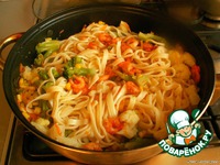 Добавить к овощам лапшу и креветки, посолить, поперчить, посыпать тертым сыром |