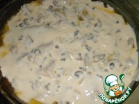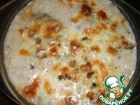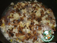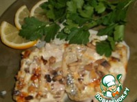 Выложить рыбу в сковороду с толстыми стенками. Посыпать нарезанным луком и частью тушеных грибов, добавить вино, накрыть крышкой и тушить минут 20. |