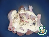 Голени положить в миску, посолить, поперчить по вкусу и добавить майонез |