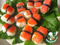 Форель и огурцы нарезаем длинными полосками. Затем делаем все тоже самое, что в предыдущих роллах, только посередине слоя риса выкладываем полоски рыбы и огурца, поперек листу нори, слегка вдавливая их в рис. Заворачиваем рулет, нарезаем роллы. |
