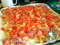 Перец снова посыпать сыром, на него - слой копченой колбасы, затем мелко порезанные помидоры |