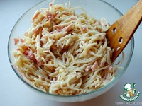 Спагетти разломать на кусочки длиной примерно 5 см или меньше. Отварить в кипящей подсоленной воде, откинуть на дуршлаг, остудить. |
