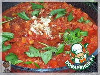 Выдавливаем чеснок, солим, перчим, пару щепоток сахара, 3-4 ложки оливкового масла, 10-12 листиков базилика, перемешаем и наш соус готов. |