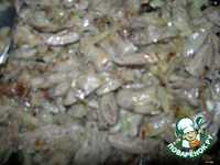 Куриные сердечки отварить, порезать тонкими полосками и обжарить вместе с луком. |