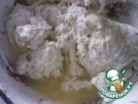 Добавить муку. Вымешать. Затем растопленный маргарин. |