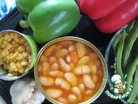 Фасоль, кукурузу, салатный перец, стручковую фасоль перемешиваем в салатнице; добавим пропущенный через пресс чеснок; |