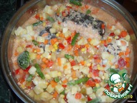 Берём сковородку побольше, выкладываем в неё рыбу, заливаем маринадом, тушим минут 15, добавляем овощную смесь. |