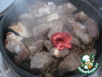 Добавляем к мясу и тушим около 3-5 мин.; добавим томат-пасту, перемешаем (еще 2-3 мин.). |