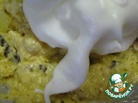 Отделить белки от желтков; желтки растереть с 1/3 частью сахара, добавить маскарпоне и взбить вместе, добавить к муке и хорошо перемешать. |