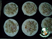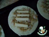 На кружочке выложить тушеный лук, креветки, накрыть полоской сыра, и кружочками помидора, края защипать и выпечь. |