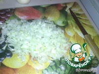 3.Режем лук полукольцами, кубиками и добавляем к кролику.Туда же базилик. |