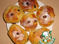Пряности перемешать, добавить до теста вместе с изюмом.Тесто перемешать. Кусочкам теста придать шарикообразною форму. Выложить на форму, смазанную растительним маслом, на расстояние 5 см друг от друга.