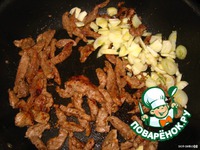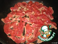 Режем мясо против волокон, небольшими полосочками |