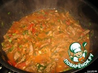 Доводим до готовности на более медленном огне, помидоры дают много сока... И можно не добавлять воды, зимой (когда помидоры не настоящие))), я добавлюю воды или бульона... |