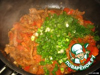 В обжаренное мясо выкладываем лук зеленый и помидоры, приправляем, перчим, солим, и несколько капелек соуса Табаско... |