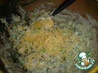 Добавим 150г натертого сыра,порезанного крупно чеснока. А также специи. |