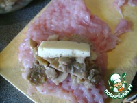 Сыр 100гр.порезать на брусочки. На грудку выложить обжаренные грибы и брусочек сыра. |