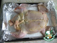 Курицу вымыть, разрезать вдоль и аккуратно вырезать грудку с хребтом. Крылья и ножки оставляем, замариновать курочку (вино, чеснок, специи, соль). Я мариновала на ночь. |