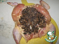 Вынимаем курочку из маринада, она очень вкусно пахнет, во внутрь натираем сыр. |