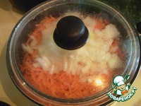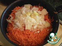 Морковь трем на крупной терке, лук мелко режем, выкладываем в глубокую сковородку. |