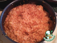 Перемешиваем, немного прогреваем, чтобы рис пропитался и приобрел красивый оранжевый цвет. |