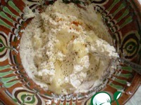 Чеснок очистить и измельчить. Смешиваем его с творогом, размягчаем. Добавляем измельчённые лук и укроп, перец чёрный и соль. Всё перемешиваем. |