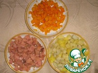 Рыбу мелко нарезать. Картофель и морковь сварить и мелко нарезать. |