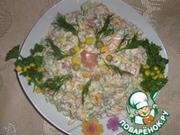 В тарелку положить картофель, морковь, рыбу, болгарский перец, огурец, кукурузу, горошек, зелень, майонез, соль, перец. Все хорошо перемешать. |