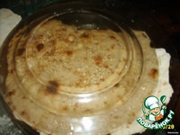 Лепёшки делаю так - муку, воду и соль, беру всё на глаз, замешиваю тесто, раскатываю среднего размера лепёшки, жарю на сухой сковороде. Принцип приготовления как у лаваша. |