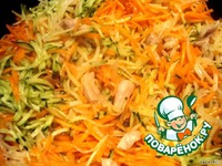 В раскаленном масле обжариваем куриное мясо в течении одной минуты, добавляем туда овощи и продолжаем обжаривать на сильном огне, постоянно помешивая, 3-4 минуты. |