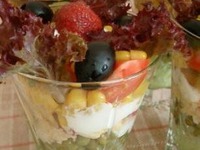 -листовой салат, на него - буквально капля майонеза, на нее - целая клубничка.