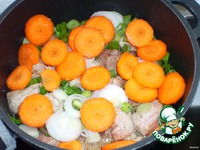 Нарезать лук, морковь шайбами, посолить, поперчить, добавить немного воды |