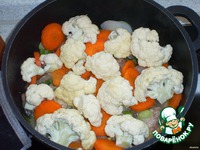 Цветную капусту отправляем тоже в сковороду и закрываем крышкой, оставляем тушиться |