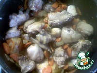 Картофель почистить и нарезать. В кастрюлю положить куриные кусочки, лук с морковью, лаврушку, душистый перец, добавить картофель и хорошенько перемешать. Посолить по вкусу. |