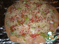 Раскатать тесто, смазать майонезом смешанным с кетчупом, затем положить последовательно ветчину, перец, лук и яйцо, полить натёртыми помидорами смешанными с чесноком, посыпать сыром. |