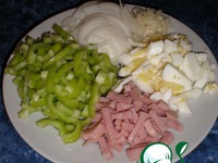 Нарезать соломкой ветчину, перец, лук и яйцо, чеснок порубить. |