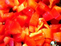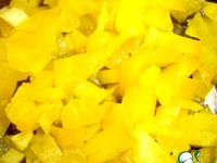 Следующий слой - желтый перец. Последний слой - красный перец. Кажый слой заливается соусом. Теперь убираем террин в холодильник до полного застывания. |