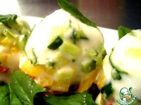 Сыр взбить со сливками, добавить распущенный желатин, чеснок, соль, перец. Взбивать еще пару минут. Во взбитый соус добавить нарезанный шпинат. |
