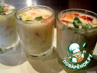 В стаканчики первым слоем выложить нарезанный огурчик. Хотя, это не принципиально. Огурцы залить соусом. |