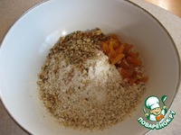 Муку просеять с солью и разрыхлителем, добавить овсяные хлопья, курагу и орехи. Перемешать. |
