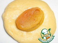 Из теста слепить маленькую лепешечку, в центр положить курагу. |